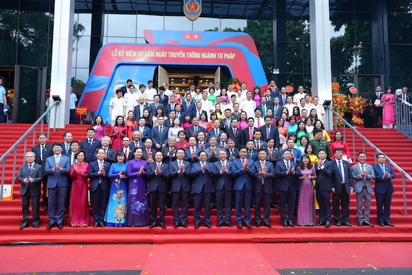 Thủ tướng Chính phủ Phạm Minh Chính chụp ảnh lưu niệm cùng các đại biểu tại Lễ kỷ niệm 80 năm Ngày truyền thống ngành Tư pháp 28/8/1945 - 28/8/2025 và Đại hội Thi đua yêu nước ngành Tư pháp lần thứ VI. (Ảnh trong bài: Phương Mai)